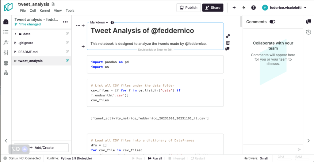 Noteable is a company that enables users to run Jupyter notebooks on their servers. They made the interface match the company’s colors and added a tool to explore datasets with no code. The platform also enables users to connect to a DB and write SQL queries inside the notebook’s cells.
